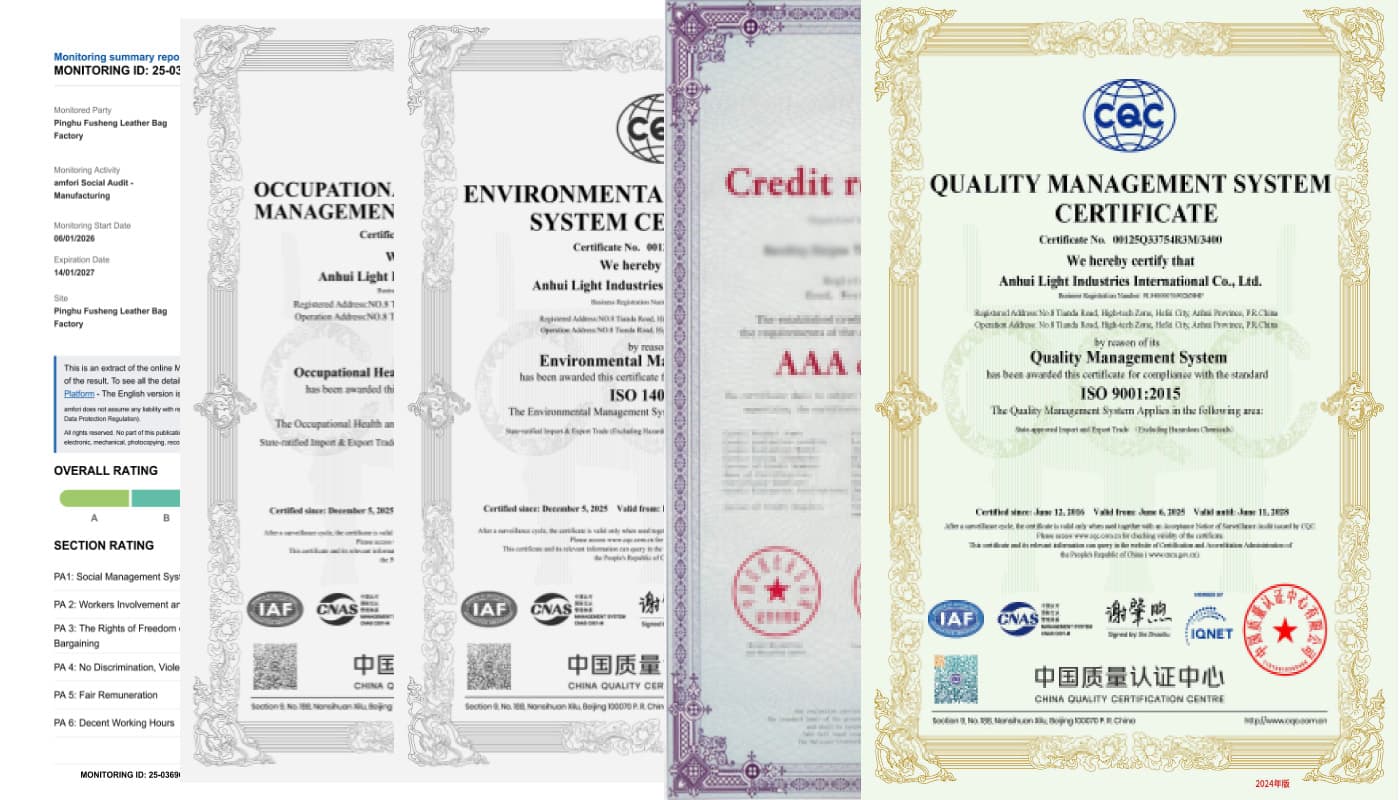 Nossos certificados industriais autênticos e qualificações profissionais garantem uma cooperação sólida para negócios globais de fabricação de bolsas.