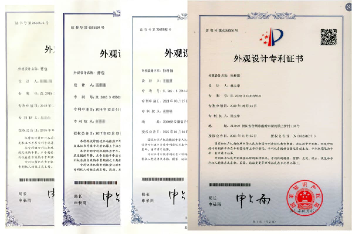 A Zabaggo possui diversas patentes nacionais reconhecidas para bolsas e malas, abrangendo design estrutural, inovação funcional, estilo e aplicação de materiais duráveis. Essas patentes exclusivas refletem nossa forte capacidade de P&D e nossa competência técnica na indústria de fabricação de malas.